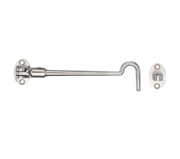A stainless steel classic cabin hook, with a hook and eye for fixing, traditionally used on cabinet doors
