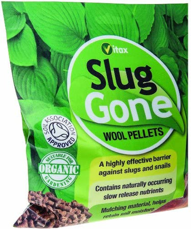 Vitax Slug Gone Wool Pellets Organic Natural Repellent Barrier Slugs Snail, suitable for organic gardening, can be used where Children & Pets have access. The swollen wool pellets form a felt-like mat that absorbs moisture from the slugs foot, thereby making it difficult for the slug to travel across. The wool pellet mat also contains abrasive particles which irritate the slug's foot, physically deterring the slug and creating a 100% natural barrier.