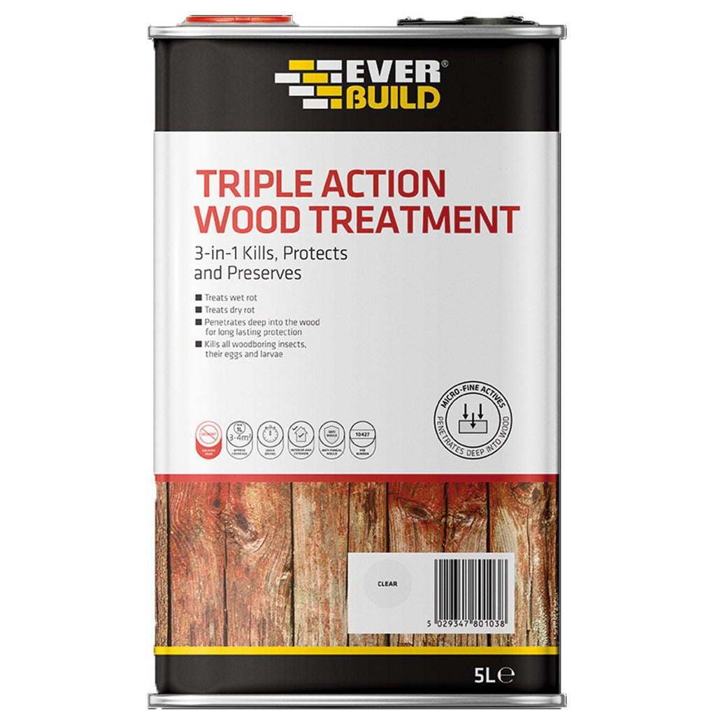 EVERBUILD Triple Action Wood Treatment takes care of all your wood treatment and preservation needs in one can. It is a solvent-free, low-odour solution based on Micro-fine active technology with added fungicides algaecides and Permethrin to actively kill and protect against wood rot, decay, fungi and wood-boring insects. The fungicides and algaecides present in these formulations are finely dispersed so that wood penetration, and hence effectiveness, is much greater than standard wood preservation products.