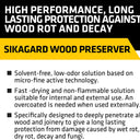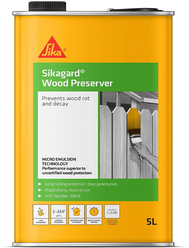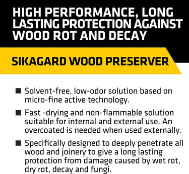 Sikagard Wood Preserver is a low solvent, low odour solution based on Micro-fine active technology. The fungicides and algaecides present in these formulations are finely dispersed so that wood penetration and hence effectiveness is much greater than standard wood preservation products. In addition the use of ultra light fast pigments on the coloured variants give an even fade resistant finish which will last for years. Sikagard Wood Preserver is fast drying and non flammable; and application to wet timbers is possible without loss of performance. It is specifically designed to deeply penetrate all wood and joinery to give long lasting protection from damage caused by wet rot, dry rot, decay and fungi.