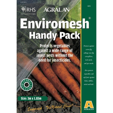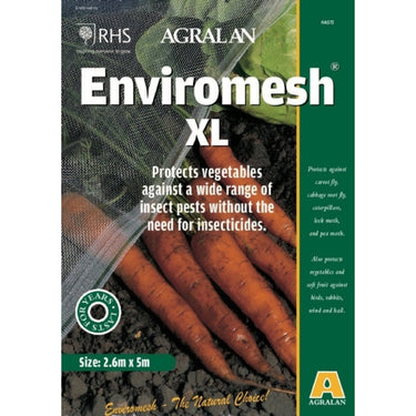 Agralan Enviromesh Protects vegetables against carrot fly, cabbage root fly, caterpillars, birds, rabbits, wind and hail. No support necessary, just place over the crop and secure with pegs or stones. A very strong netting that enables you to grow healthy fruit and vegetables without the need for pesticides. The crop may be watered (or fed with liquid fertiliser) through the mesh Lasts for 10 years given reasonable care, Approx 2.6 x 5 metres (8'6" x 16').