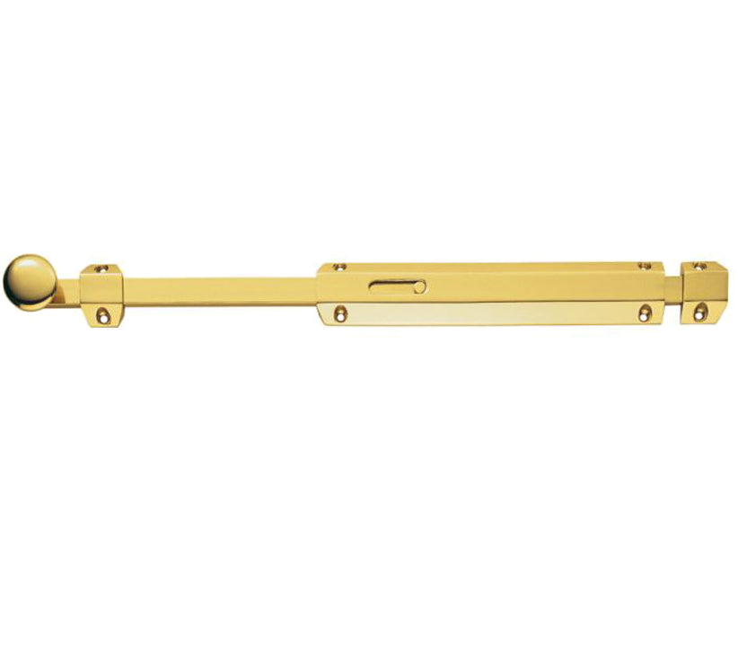 Surface mounted door bolt with an extended handle. The longer handled extension allows easier use for those low or higher fittings where a conventional sized bolt would make reaching awkward. Smooth operation, integral ball and spring mechanism for positive location of the bolt when closed