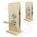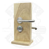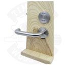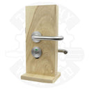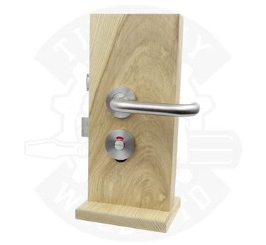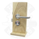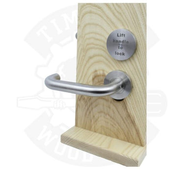 The lever works as normal for opening the door. Then you have 2 options: leave it as it is (don’t drill right through the door) or you can add a release indicator. Once inside the internal side of the lever set will be configured such that, the latch bolt is blanked off with a engraved covered escutcheon