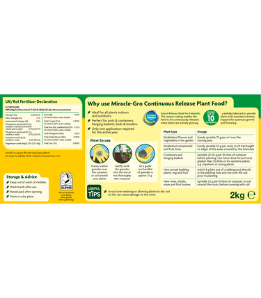 Miracle-Gro All Purpose Continuous Release Plant Food contains a temperature-controlled coating which regulates the release of nutrients when the conditions are right for feeding. One application feeds plants for up to 6 months, removing the need for regular feeding. Contains essential nutrients to give strong healthy plant. The number one selling plant food, trusted by gardeners nationwide that grows plants twice as big as unfed plants. Grows plants twice as big as unfed plants for better displays feed every two weeks from March to September Simply dissolve in water and apply using a watering can or use a Miracle-Gro hose-end feeder.