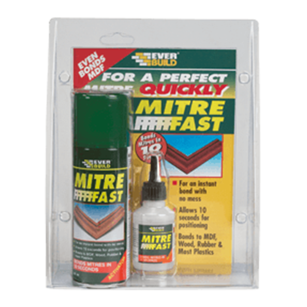 Mitre Fast Bonding Kit is a two-part instant adhesive system comprising a cyanoacrylate adhesive and aerosol activator. Mitre Fast is mainly used in the furniture, timber, kitchen and plastics industries where its instant bonding properties dramatically reduce assembly times for mitre joints when compared to conventional wood adhesives. Also suitable for bonding of MDF, rubber, PVCu, metals etc.