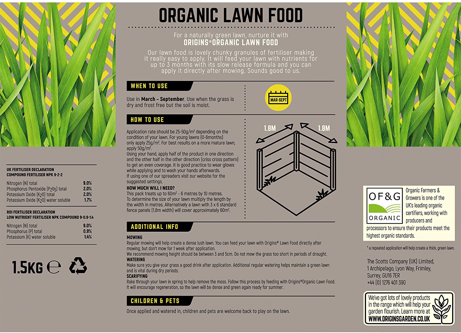 Origins Organic Lawn Food Contemporary range of naturally inspired gardening products cover all your gardening needs from your lawn to your vegetable patch. Origins range is clean, contemporary, naturally lets your garden flourish, is Organic farmers certified (where possible) and easy to use. Enriched with 3 months organic feed to promote thicker, greener results. Slow release, scorch free formula. Dust free granules.