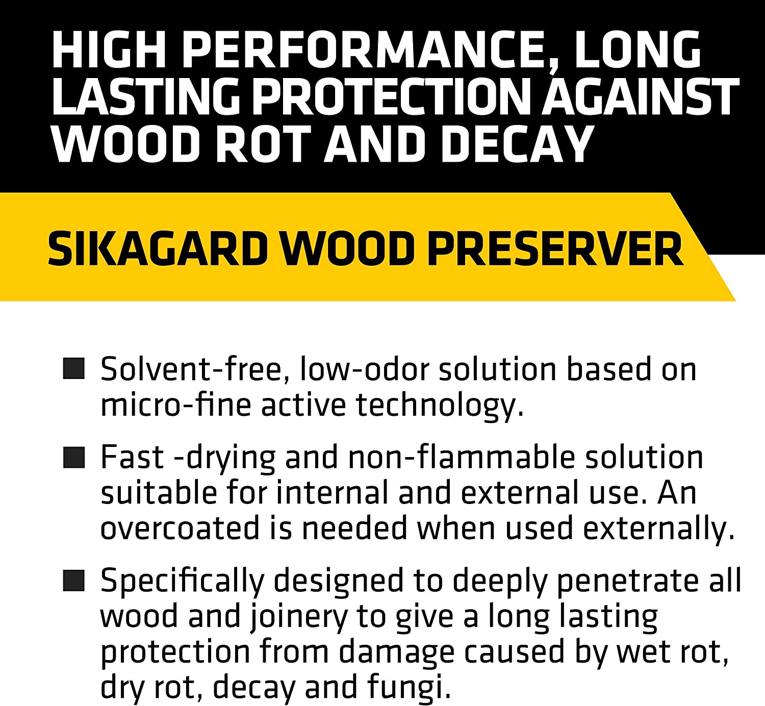 Sikagard Wood Preserver is a low solvent, low odour solution based on Micro-fine active technology. The fungicides and algaecides present in these formulations are finely dispersed so that wood penetration and hence effectiveness is much greater than standard wood preservation products. In addition the use of ultra light fast pigments on the coloured variants give an even fade resistant finish which will last for years. Sikagard Wood Preserver is fast drying and non flammable; and application to wet timbers is possible without loss of performance. It is specifically designed to deeply penetrate all wood and joinery to give long lasting protection from damage caused by wet rot, dry rot, decay and fungi.