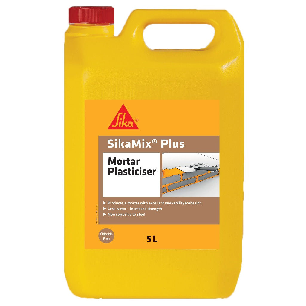 Sika Mix+ is a ready to use plasticising liquid admixture for mortars and plaster. Increases workability and improves the quality of mortars, renders and plasters. The product is CE marked as mortar admixture for masonry. As a mortar plasticising admixture in brick and block laying mortars. Providing enhanced resistance to frost attack in both wet and hardened mortar state. For production of high quality mortars and plasters with increased workability. Improves hydration process and produces high quality plaster for brickworks, masonry and coatings. 1Ltr SikaMix Plus added to 200Ltrs gauging water will be sufficient for gauging approx 4 x 50Kg cement for mortar or render mixes. Approximate Consumption: 0.125 Litres per 25kg bag of cement.